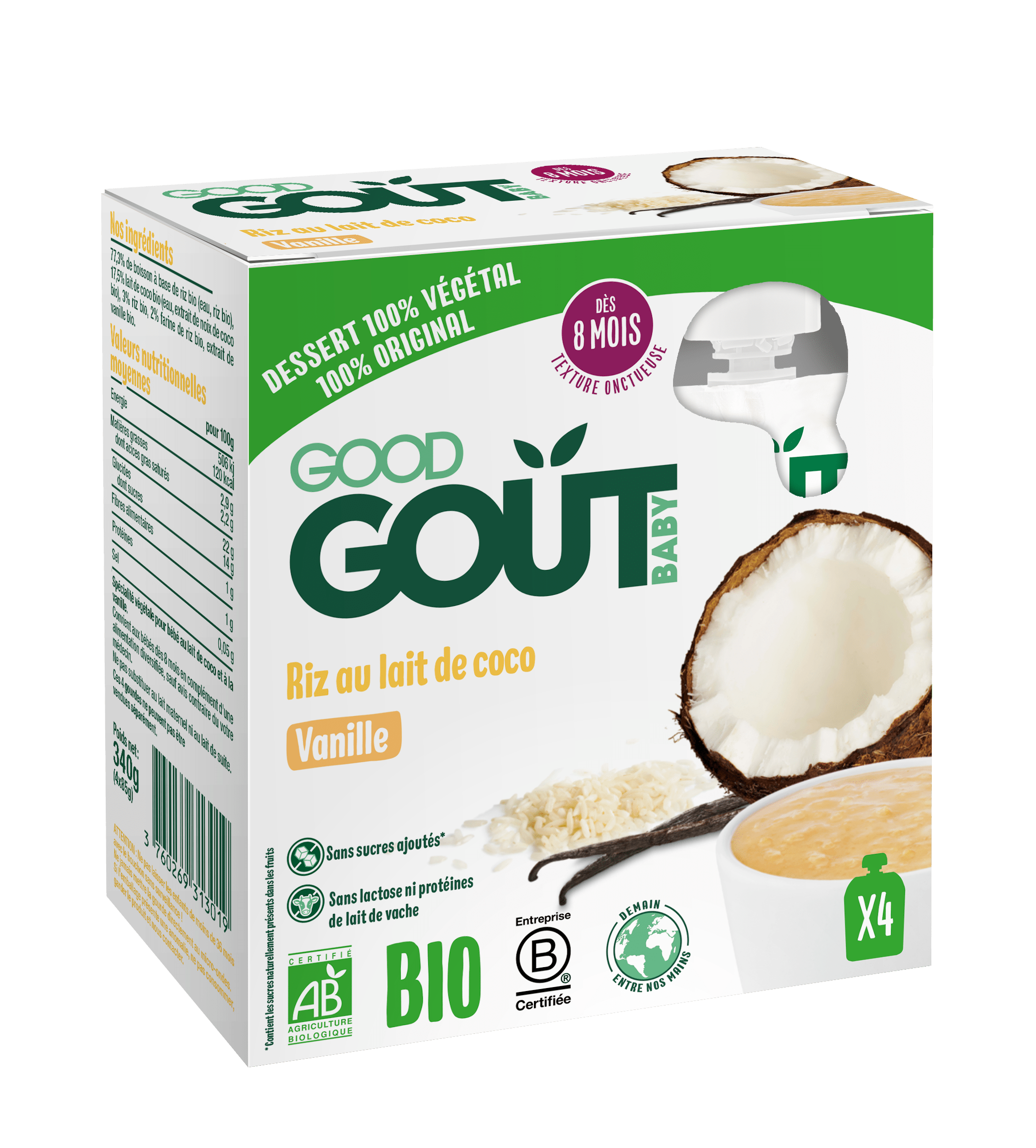 Dessert végétal riz au lait de coco, vanille bio 4x85g - dès 8 moisDessert végétal riz au lait de coco, vanille bio 4x85g - dès 8 mois