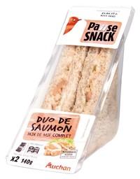 Pain de mie à la farine complète 57,1% (farine complète de blé 26.2%, eau, farine de blé, huile de colza, levure, sucre, sel, gluten de blé, farine de fèves, émulsifiant : mono- et diglycérides d'acides gras, agent de traitement de la farine : acide ascorbique), mayonnaise allégée en matières grasses 14,4% (eau, huile de colza 2,9%, moutarde de Dijon (eau, graines de moutarde, vinaigre d'alcool, sel, acidifiant : acide citrique, antioxydant : disulfite de potassium), jaune d'oeuf 0.7%, vinaigre d’alcool, amidon modifié de pomme de terre, sucre, sel; épaississants : gomme guar, gomme xanthane ; conservateur : sorbate de potassium), saumon cuit (poisson) 14,3% (saumon Salmo Salar 14.1%, sel), saumon fumé (poisson) 7,1% (saumon Salmo Salar 6.9%, sel), salade 7,1%.
