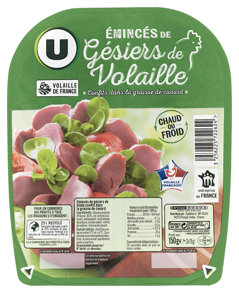 Emincés de gésiers de volaille U 2x75g soit 150gEmincés de gésiers de volaille U 2x75g soit 150g