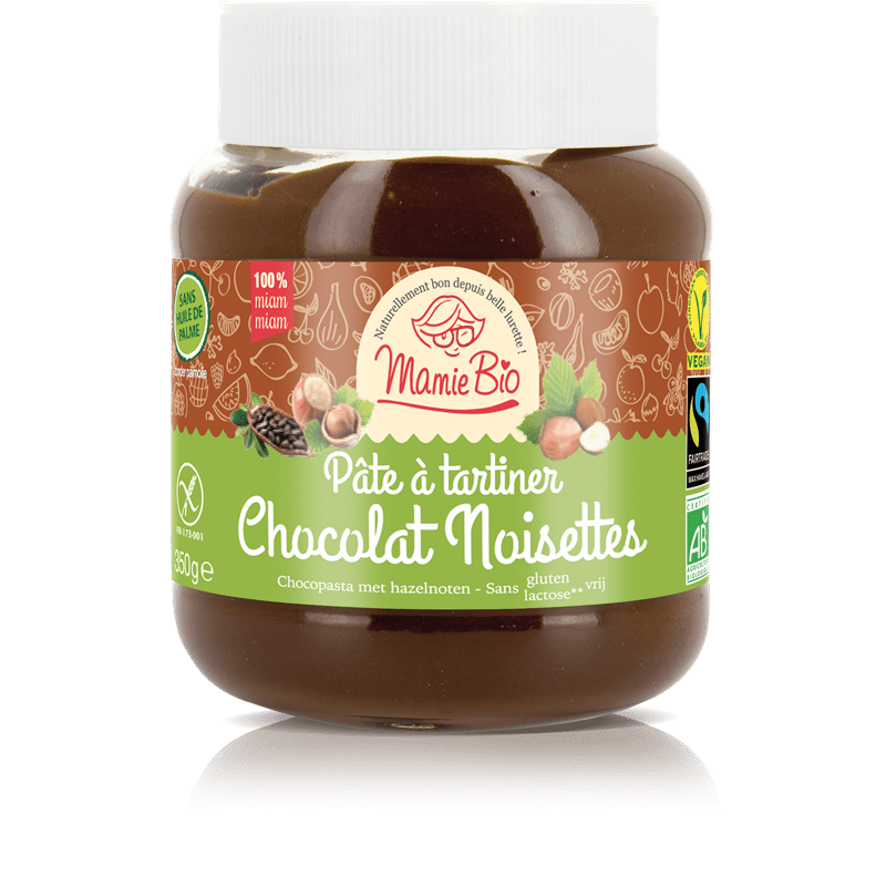 Sucre de canne*, huile de tournesol* désodorisée, chocolat* 18% (sucre de canne*, poudre de cacao maigre*, beurre de cacao*), purée de NOISETTES 10%, farine de SOJA*, émulsifiant : lécithines* (SOJA), poudre de vanille Bourbon. *produits issus de l'agriculture biologique.
