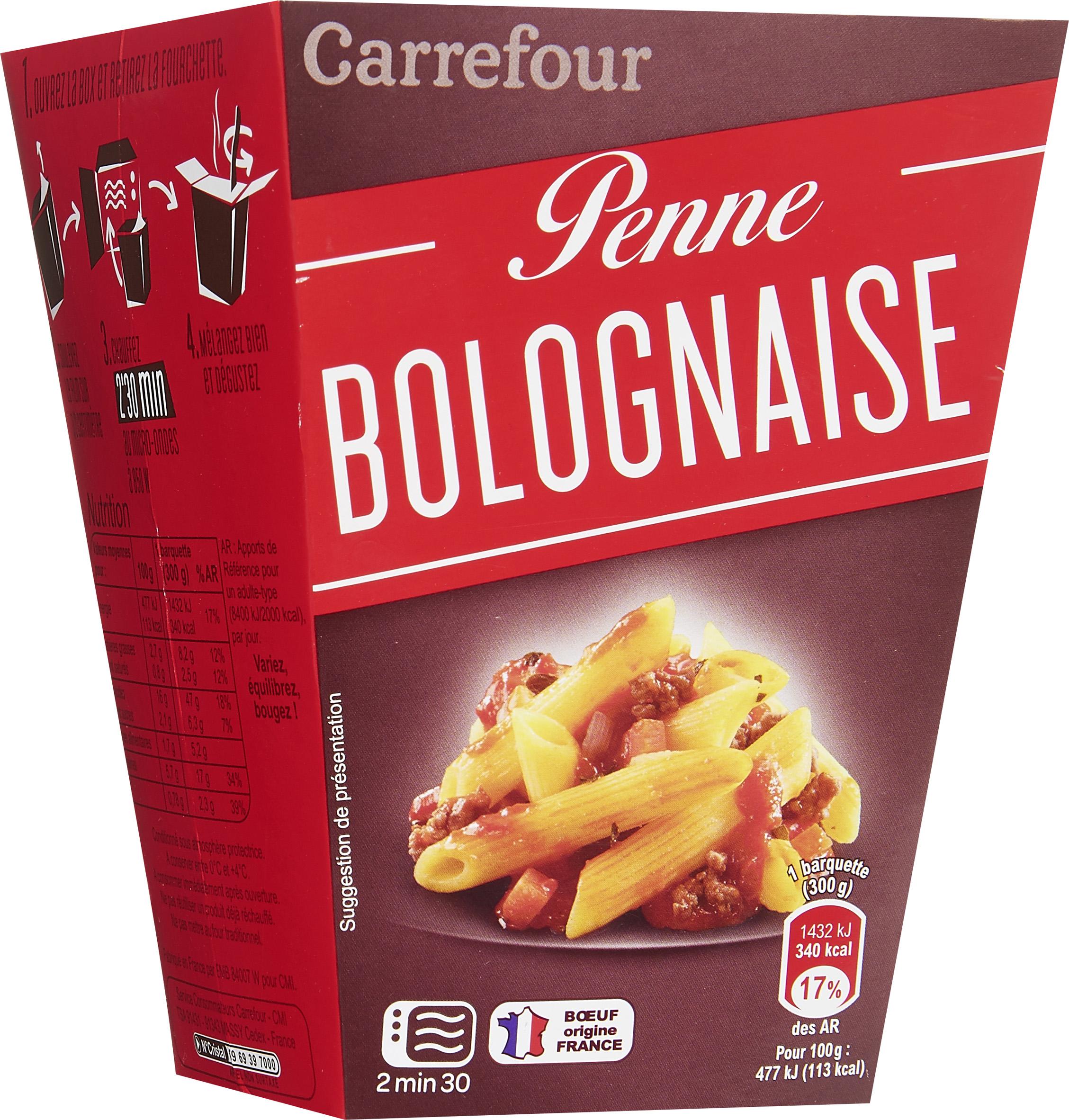 Pâtes alimentaires aux ŒUFS cuites 45% (eau, semoule de BLÉ dur, ŒUF 4,5%), concassé de tomate à la purée de tomate 20% (tomate pelée concassée, purée de tomate), viande de bœuf 13% (origine : France), eau, double concentré de tomate 4,5%, oignon préfrit (oignon, huile de tournesol), huile de tournesol, carotte 1,6%, arôme naturel de paprika, sel, sucre, ail en poudre, épaississant : gomme xanthane, curcuma, romarin, thym.