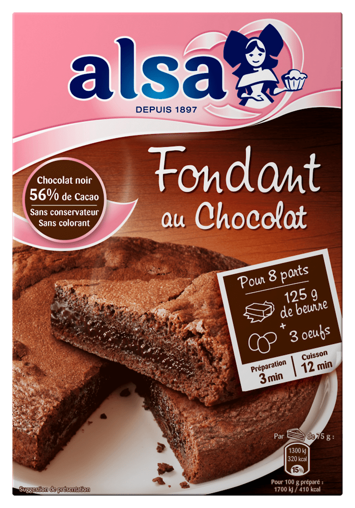 Sucre, chocolat en poudre : 34% (sucre, cacao), chocolat noir extra-fin à 58% de cacao : 14% (pâte de cacao, sucre, beurre de cacao, émulsifiant : lécithine de SOJA, arôme naturel de vanille), farine de BLÉ, épaississant : gomme xanthane.