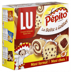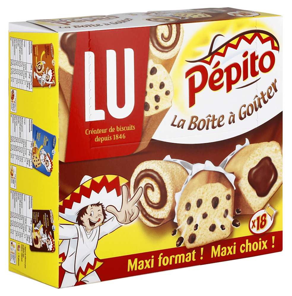 Assortiment de gâteaux moelleux: pépito chocolat'o : gâteau moelleux fourré au chocolat : farine de BLE 20,6%, sirop de glucose-fructose, huile de palme, sucre, ŒUFS 11,4%, chocolat noir 6,1% (pâte de cacao, sucre, cacao maigre en poudre, émulsifiant (lécithine de SOJA), arôme), stabilisant (glycérol), LAIT ÉCRÉMÉ en poudre, amidon de BLE, LAIT entier en poudre, poudre à lever (diphosphate disodique, carbonate acide de sodium), sel, épaississant (gomme xanthane), sirop de glucose, émulsifiants (E472b, E475), arômes. Pépito pépites : gâteau fourré aux pépites de chocolat : farine de BLE 23,6%, pépites de chocolat 18,6% (pâte de cacao, sucre, émulsifiant (lécithine de SOJA))) huile de palme, ŒUFS 13,1%, sucre, sirop de glucose-fructose, stabilisant (glycérol), poudre à lever (diphosphate disodique, carbonate acide de sodium), sel, épaississant (gomme xanthane), sirop de glucose, émulsifiants (E472b, E475), arômes, LAIT ÉCRÉMÉ en poudre. Pépito mini roulés : mini génoise fourrée au chocolat : sirop de glucose-fructose, farine de BLE 17,5 %, ŒUFS 15,9 %, sucre, chocolat noir 10,5 % [pâte de cacao, sucre, cacao maigre en poudre, émulsifiant (lécithine de SOJA), arôme), huiles végétales (palme, colza), LACTOSÉRUM en poudre (de LAIT), stabilisant (glycérol), LAIT entier en poudre, son de BLE, épaississants (E1414, gomme xanthane), conservateur (sorbate de potassium), émulsifiant (E471), sel, poudre à lever (diphosphate disodique, carbonate acide de sodium), correcteur d'acidité (acide citrique), arômes, antioxydant (extrait de romarin).