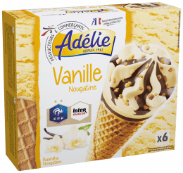 Glace vanille 47,5%, glace vanille blanche 25%, gaufrette 13,9%, pâte à glacer au cacao maigre 11% et nougatine 2,6% en décorGlace vanille 47,5%, glace vanille blanche 25%, gaufrette 13,9%, pâte à glacer au cacao maigre 11% et nougatine 2,6% en décor