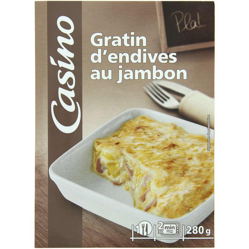 Endive émincée 36% - LAIT DEMI-ÉCRÉMÉ - jambon cuit standard fumé 13% [jambon de porc 9% (origine : UE) - eau - sirop de glucose - sel - dextrose - arômes naturels - antioxydant : érythorbate de sodium - conservateur : nitrite de sodium] - CRÈME fraîche - LACTOSE et PROTÉINES DE LAIT en poudre - farine de BLÉ - EMMENTAL râpé - CRÈME en poudre - sel - épaississant : gomme xanthane - muscade - poivre - paprika - curcuma. Les informations en gras sont destinées aux personnes intolérantes ou allergiques.