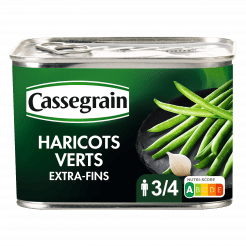 Haricots verts extra-fins 54%, eau, sel, oignons grelots 0,2%.