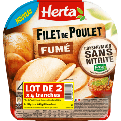 HERTA Filet Poulet Fumé conservation sans nitrite x4 LOT 2-240gHERTA Filet Poulet Fumé conservation sans nitrite x4 LOT 2-240g