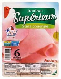 Jambon de porc issu d’animaux nourris sans OGM (< 0.9%) , sel, dextrose, conservateurs : chlorure de potassium, nitrite de sodium, sirop de glucose, arôme, antioxydant : érythorbate de sodium. Elaboré à partir de porc origine France