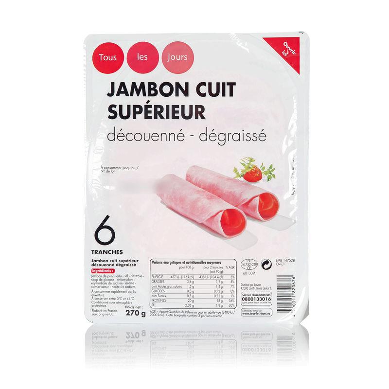 Jambon cuit supérieur découenné dégraissé 6 tranches TOUS LES JOURSJambon cuit supérieur découenné dégraissé 6 tranches TOUS LES JOURS