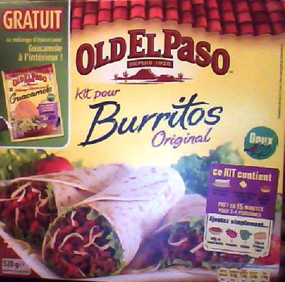 Tortillas de blé nature : Farine de blé 60%, eau, glycérol, huile de palme, huile de colza, carbonate acide de sodium, diphosphate disodique, mono- et diglycérides d'acides gras, dextrose, sel, sorbate de potassium. Sauce original Salsa : Tomates 61%, oignons 16%, poivrons verts 10%, concentré de tomate, sel, vinaigre, copeaux d'oignons déshydratés, sucre, oignon en poudre, jus de citron concentré, piment de Guajillo, ail en poudre, épices, acide citrique. Mélanges d'épices pour Burritos : Haricots rouges en poudre, légumes déshydratés (oignon, paprika, ail), amidon de pomme de terre, épices 11.6% (piment chili, paprika, cumin, poivre noir), sel, sirop de glucose déshydraté, extrait de levure, arôme, sucre, acide citrique, betterave rouge, extrait d'épice (paprika), origan. Contient du blé