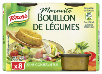 Ingrédients : eau, sel, carotte réhydratée¹ : 7,5%, graisse de palme, sucre, poireau réhydraté¹ : 5%, extrait de levure, poivron rouge réhydraté¹ : 2,3%, CÉLERI-rave réhydraté¹ : 0,9%, gélifiants : gomme xanthane et farine de graines de caroube, arômes, épices et aromates (persil¹ : 0,3%, graines de CÉLERI, livèche¹, noix de muscade, poivre), caramel, maltodextrine. ¹ingrédients issus de l'agriculture durable : 16%. Teneur en légumes¹ : 15,7%.