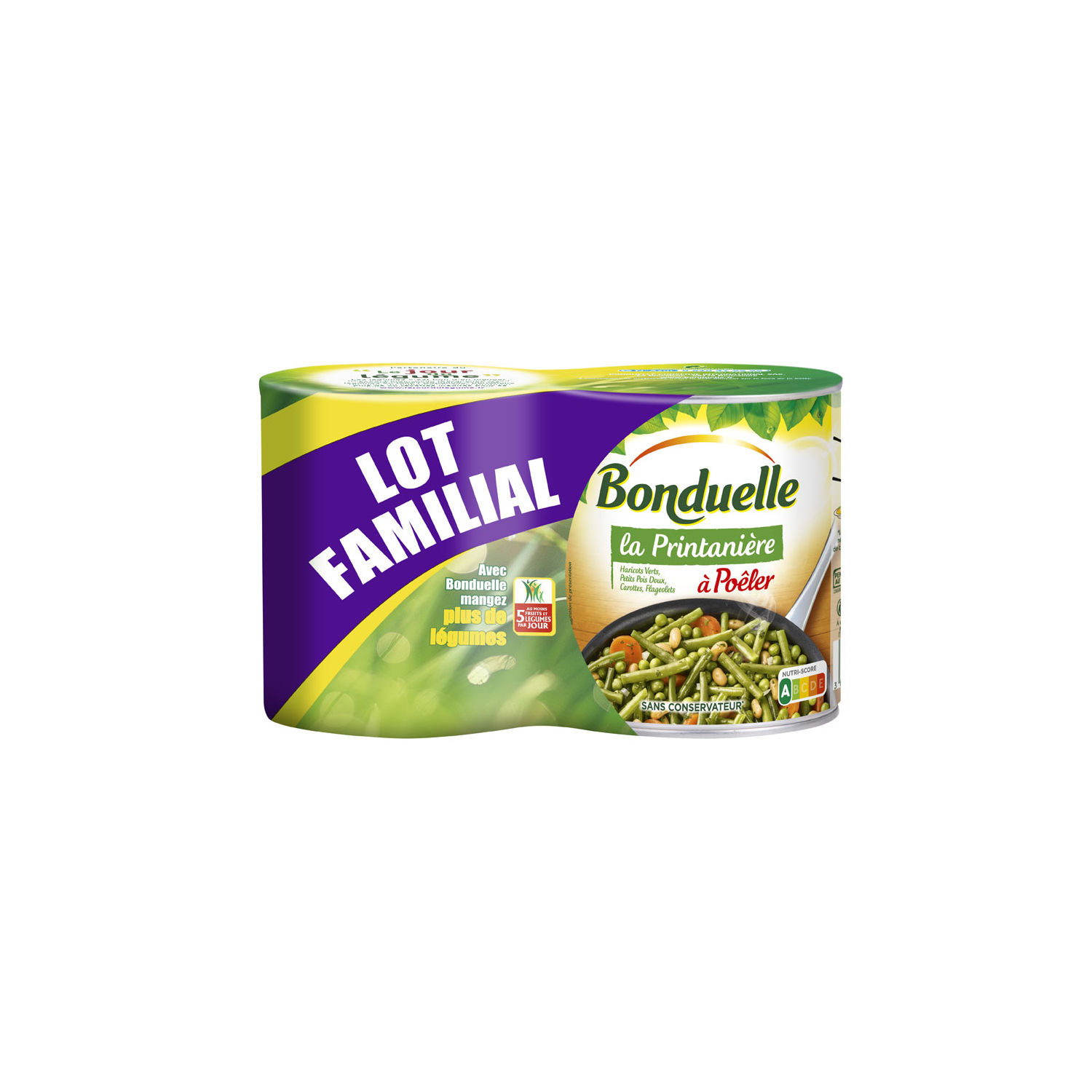 Haricots verts coupés 45%, petits pois doux 15%, carottes en rondelles 11%, flageolets 11%, oignons en dés, eau, huile d'olive vierge extra, persil 1,6%, sel, ail 0,4%, arômes naturels*, antioxydant : acide ascorbique. *présence d'ingrédients d'origine animale (poule)