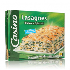 Eau - FROMAGE de chèvre 22% - pâtes à lasagnes cuites 19,2% (semoule de BLÉ dur - eau) - épinards 8,5% - amidon transformé de maïs - farine de BLÉ - LAIT ÉCRÉMÉ en poudre - FROMAGE à pâte dure 1,5% - huile de colza - sel - extraits d'épices - arôme naturel de poivre. Les informations en gras sont destinées au personnes intolérantes ou allergiques.