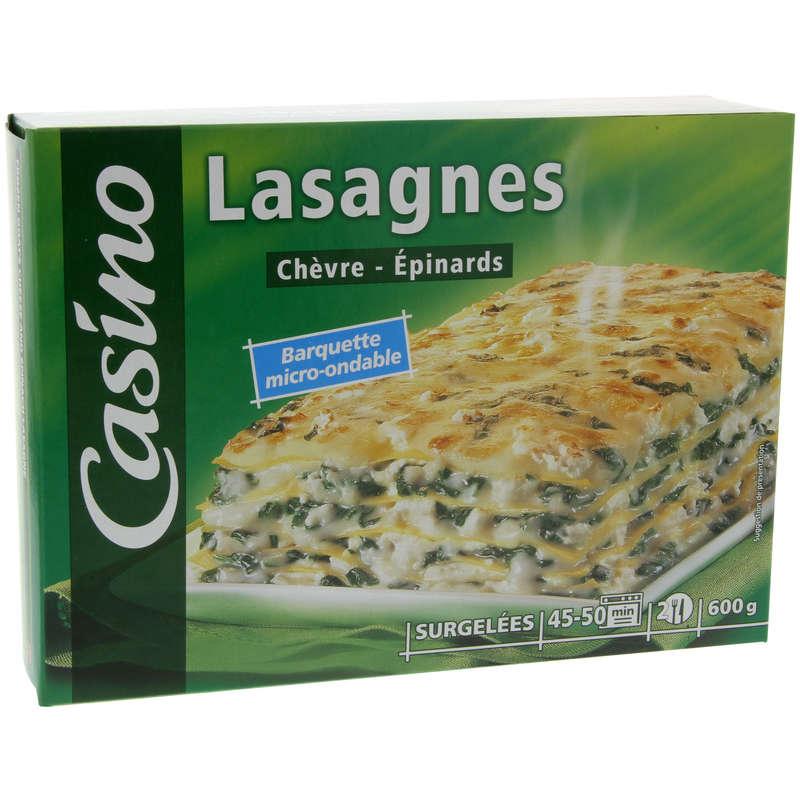 Eau - FROMAGE de chèvre 21,9% - pâtes à lasagnes cuites 19,3% (semoule de BLÉ dur - eau) - épinards 8,5% - amidon transformé de maïs - farine de BLÉ - LAIT ÉCRÉMÉ en poudre - FROMAGE à pâte dure 1,6% - huile de colza - sel - extraits d'épices - arôme naturel de poivre. Les informations en gras sont destinées au personnes intolérantes ou allergiques.