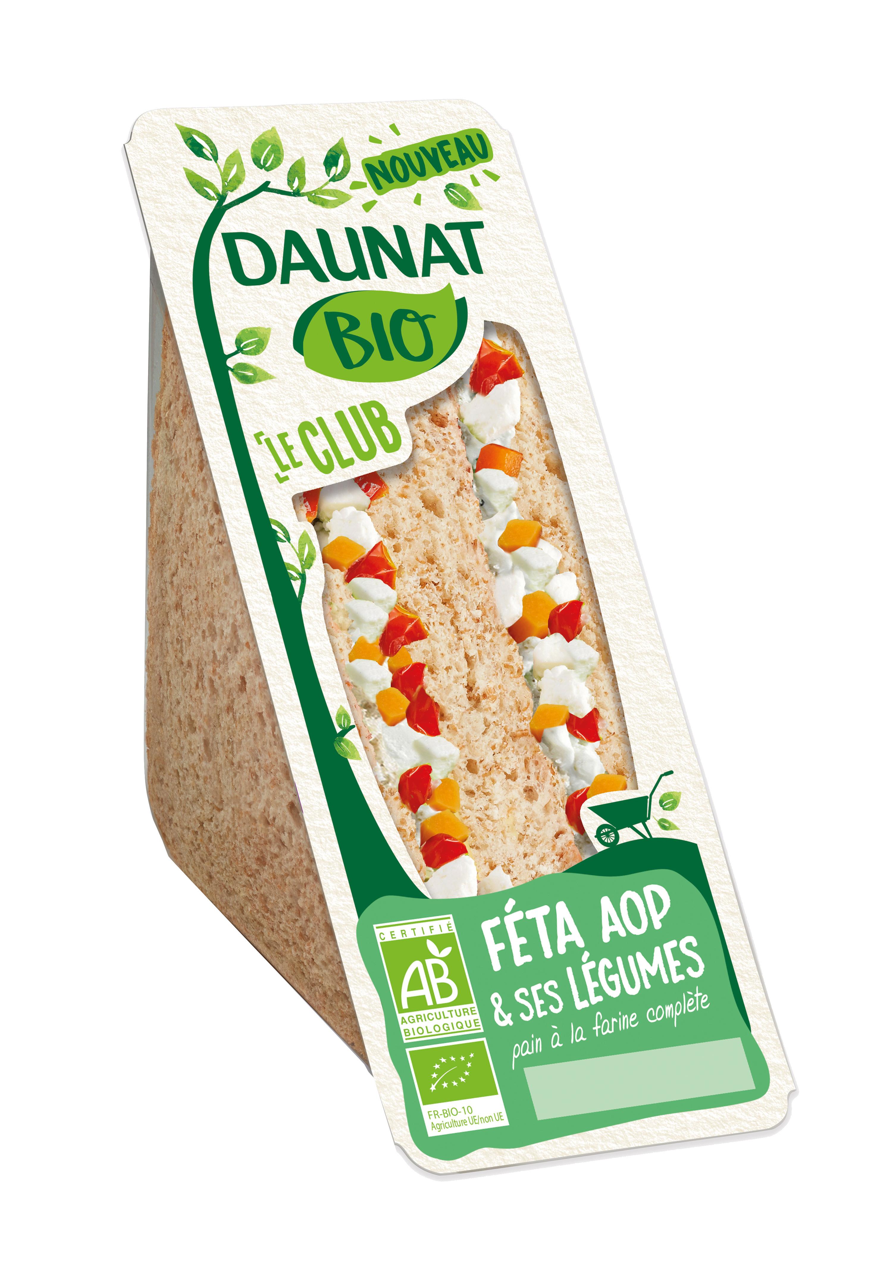 Pain de mie à la farine complète* 50 % (Farine de BLÉ*, eau, farine complète de BLÉ* 6.5%, sucre de canne roux*, levure, huile de colza*, son de BLÉ*, sel, gluten de BLÉ*). Garniture : Féta* AOP 18% (LAIT* de brebis et de chèvre pasteurisé, sel, FERMENTS LACTIQUES (dont LAIT), coagulant microbien), Sauce au FROMAGE BLANC aux herbes* 18% [FROMAGE BLANC 3.6% de matières grasses* (6.36%), huile de colza*, eau, amidon de maïs*, vinaigre d’alcool*, MOUTARDE de Dijon* (eau, graines de MOUTARDE*, vinaigre d’alcool*, sel), sucre*, sel, herbes 0.18%], Carottes* 9%, Tomates séchées marinées* 6% (tomate* 5.1%, huile de tournesol* 0.4%, sel, origan* 0.02%, ail* 0.02%). (% exprimés sur le produit fini) *Issus de l’agriculture biologique.