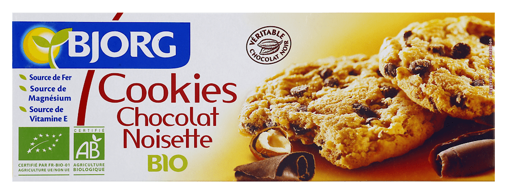 Sucre roux de canne* 20%, farine de BLÉ*, pépites de chocolat noir 17,5% (sucre de canne*, pâte de cacao*, beurre de cacao*), farine complète de BLÉ 15,5%, huile de colza*, NOISETTES* 7,5%, fibres d'acacia*, amidon de BLÉ*, poudre de LAIT ÉCRÉMÉ*, OEUF entier en poudre*, poudre à lever : carbonates d'ammonium, émulsifiant: lécithines (SOJA*), sel marin,