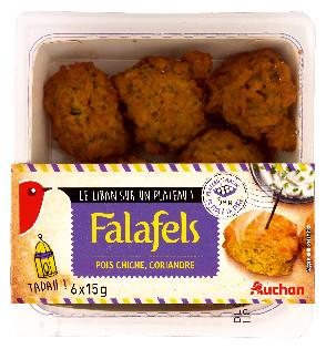 Pois chiche 31.6% (pois chiche, eau, sel), oignon réhydraté, crème (crème (lait), stabilisant : carraghénanes), farine de blé, eau, protéine et amidon de blé, huile de tournesol, œuf entier en poudre, ail, sel, persil, coriandre 0,76% ; poudres à lever : diphosphates, carbonate de sodium ; amidon de blé, cumin 0,60%, curcuma, poivre.