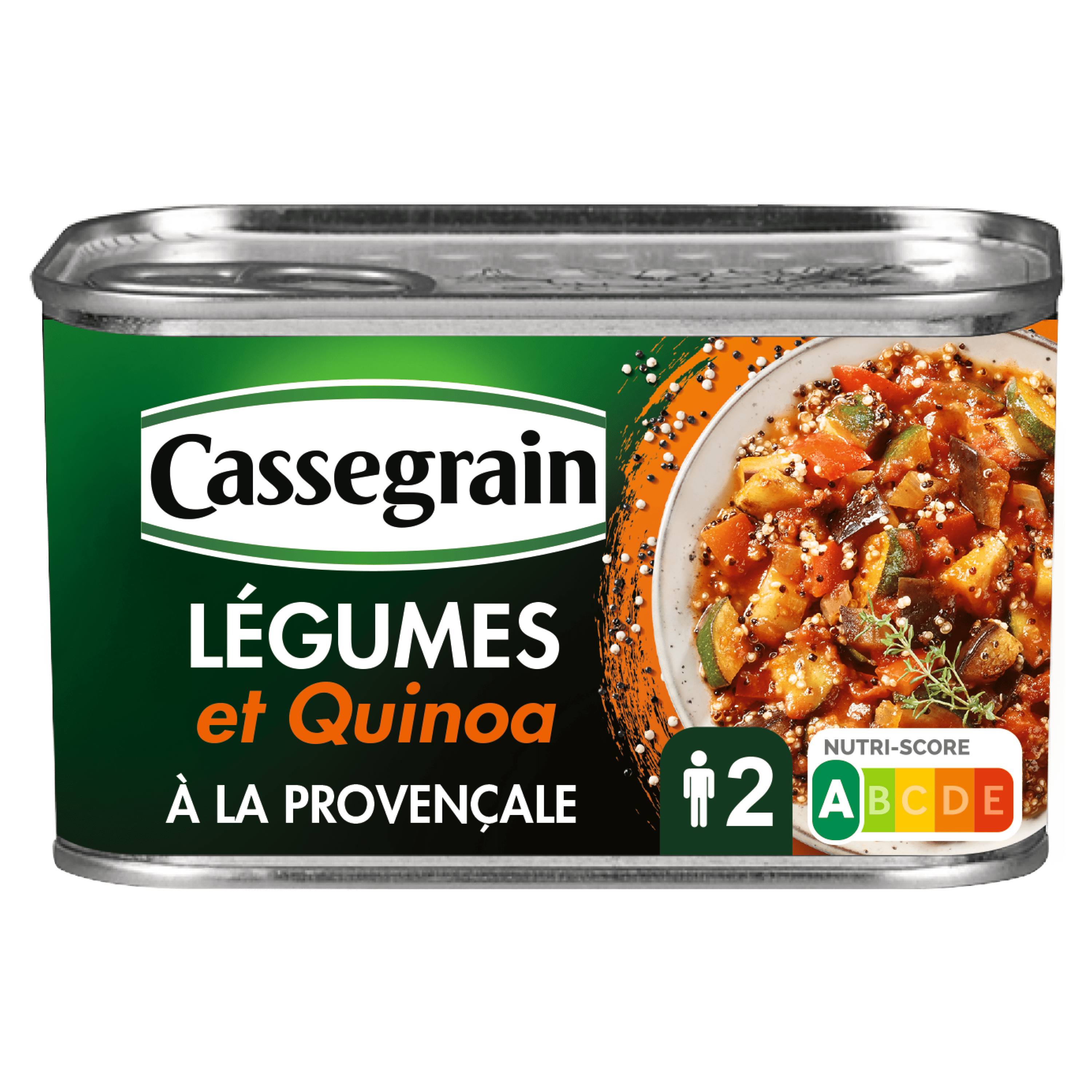 Aubergines en dès préfrites 23% (aubergines 20%, huile de tournesol), courgettes en quartiers 23%, purée de tomates mi-réduite 20%, oignons en dés 12%, poivrons rouges en dés 7.6%, double concentré de tomates, quinoa blanc 2.4%, quinoa noir 2.4%, huile d'olive vierge extra 1.9%, sucre 0.9%, sel, jus concentré de citron, ail, farine de BLE, thym.
