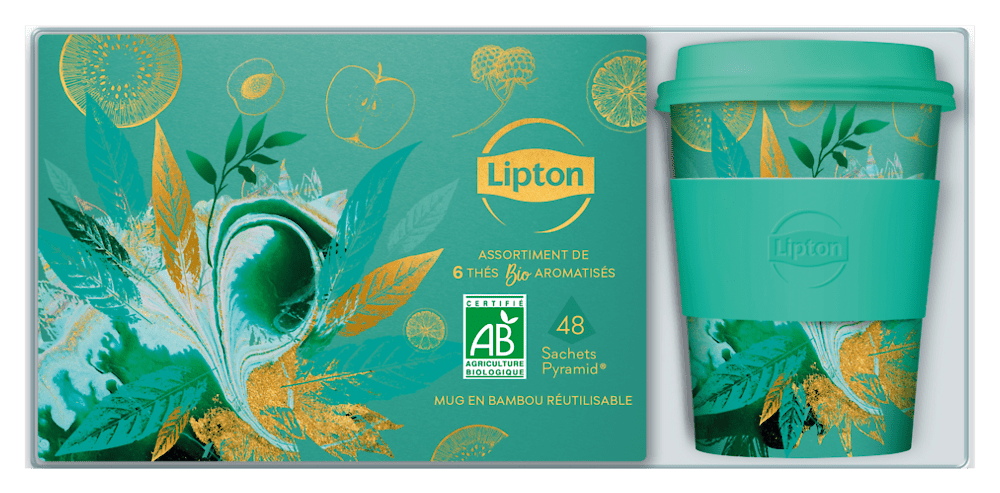 Lipton Assortiment Bio avec Mug Réutilisable en Bambou 6 Thés Noirs & Verts Aromatisés 48 Sachets Pyramid®Lipton Assortiment Bio avec Mug Réutilisable en Bambou 6 Thés Noirs & Verts Aromatisés 48 Sachets Pyramid®