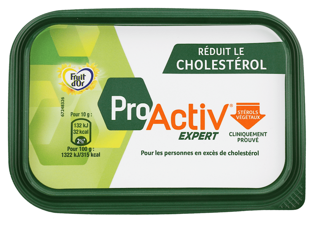 Ingrédients : eau, huiles végétales 31% (tournesol, lin, palme 3,6%, colza, palmiste)², esters de stérol végétal (9% dont 5,4% de stérols végétaux), amidon modifié, sel 0,7%, émulsifiants : mono-, diglycérides d'acides gras et lécithine de tournesol, poudre de BABEURRE (LAIT), conservateur : sorbate de potassium, correcteur d'acidité : acide citrique, arôme naturel, vitamines a et d, colorant : caroténoïdes. ²la combinaison de ces huiles végétales donne à ce produit fruit d’or proactIV expert un profil riche en acides gras insaturés (75%, dont les oméga 3 et 6), formulé avec l’aide de nutritionnistes. Unilever soutient la production d’huile de palme durable. Pour plus d’information : www. Unilever. Fr/sustainable-living. contient des stérols végétaux ajoutés. Un apport journalier en stérols végétaux de 1,5g à 2,4g permet de réduire le cholestérol de 7 à 10% en deux à trois semaines dans le cadre d'une alimentation variée et équilibrée riche en fruits et légumes et d'un mode de vie sain. Une cholestérolémie élevée constitue l'un des facteurs de risque de développement d'une maladie cardiaque coronarienne. Il existe plusieurs facteurs de risque de maladie cardiaque coronarienne et il est important de prendre soin de chacun pour réduire son risque global de maladie cardiaque coronarienne. Fruit d'or proactIV expert n'est pas destiné aux personnes qui ne doivent pas contrôler leur taux de cholestérol sanguin. Ce produit peut ne pas convenir aux femmes enceintes ou alLAITAntes ainsi qu'aux enfants de moins de 5 ans car ils ont des besoins nutritionnels spécifiques. Les patients sous traitement hypocholestérolémiant doivent consulter leur médecin avant de consommer ce produit. Consommer plus de 3g de stérols ou de stanols végétaux par jour n'apporte pas de bénéfice supplémentaire et doit être évité. Une portion de 10g de fruit d'or proactIV expert apporte 0,54g de stérols végétaux. Consommer 3 portions de 10g par jour de fruit d’or proactIV expert permet d’obtenir la dose de stérols végétaux pour réduire votre cholestérol.