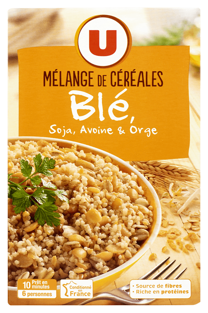 Mélange 4 céréales blé soja avoine orge U étui carton 400gMélange 4 céréales blé soja avoine orge U étui carton 400g