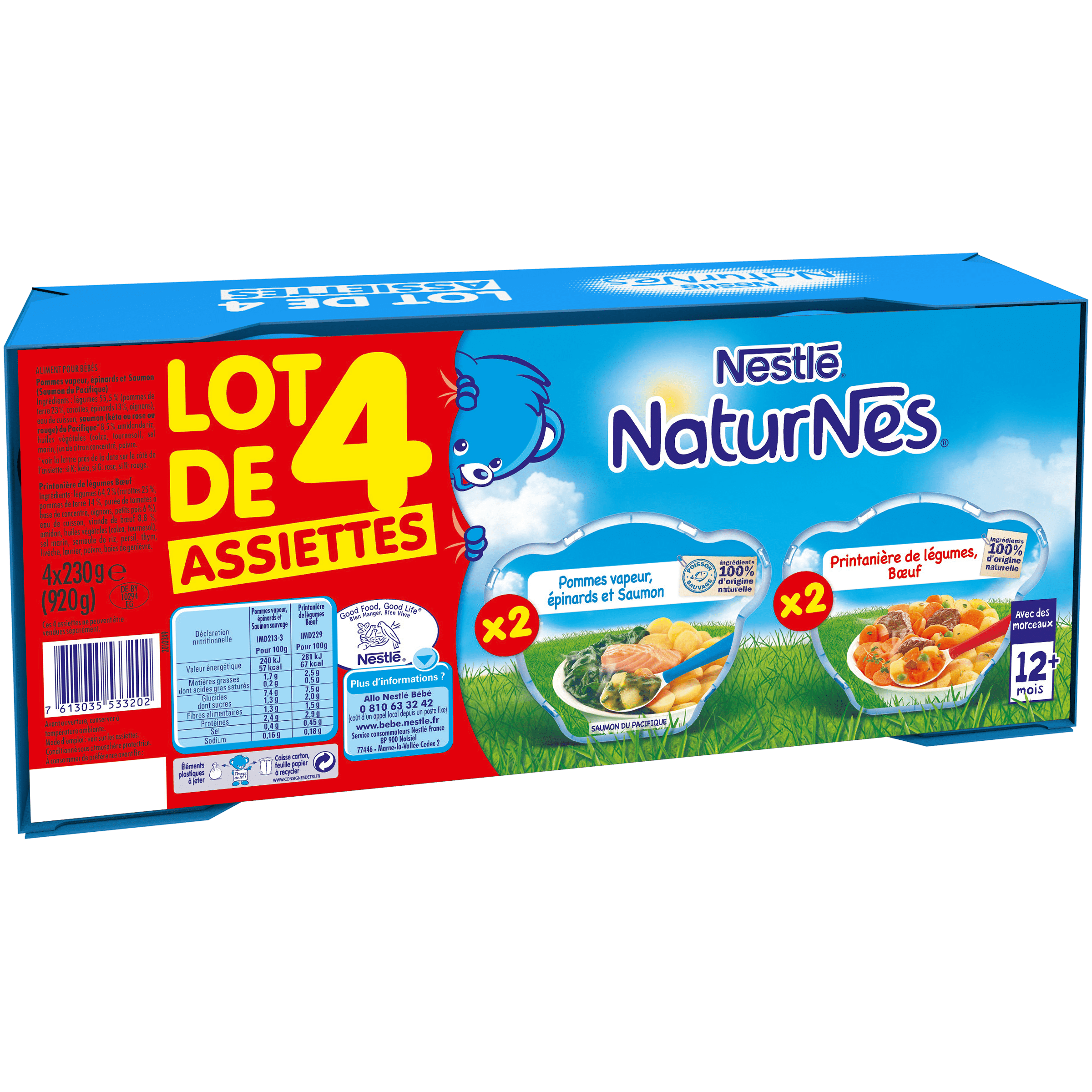 NESTLE NATURNES lot de 4 assiettes : Pommes vapeur, Epinards, Saumon & Printanière de légumes, Bœuf - Dès 12 mois, 4X230gNESTLE NATURNES lot de 4 assiettes :  Pommes vapeur, Epinards, Saumon & Printanière de légumes, Bœuf - Dès 12 mois, 4X230g