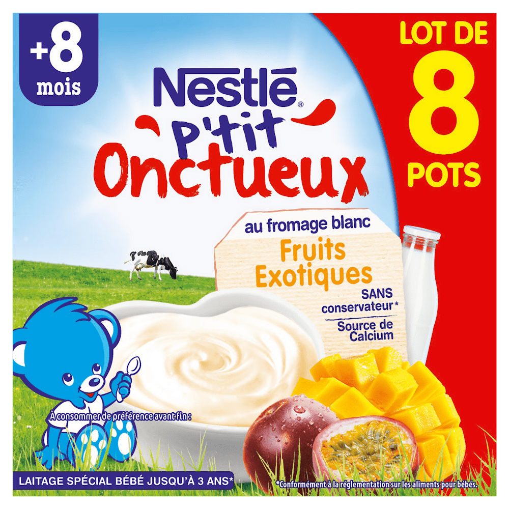 NESTLE P'TIT ONCTUEUX au Fromage Blanc Fruit Exotiques (LOT de 8) - 8 x 100g - Dès 8 moisNESTLE P'TIT ONCTUEUX au Fromage Blanc Fruit Exotiques (LOT de 8) - 8 x 100g - Dès 8 mois