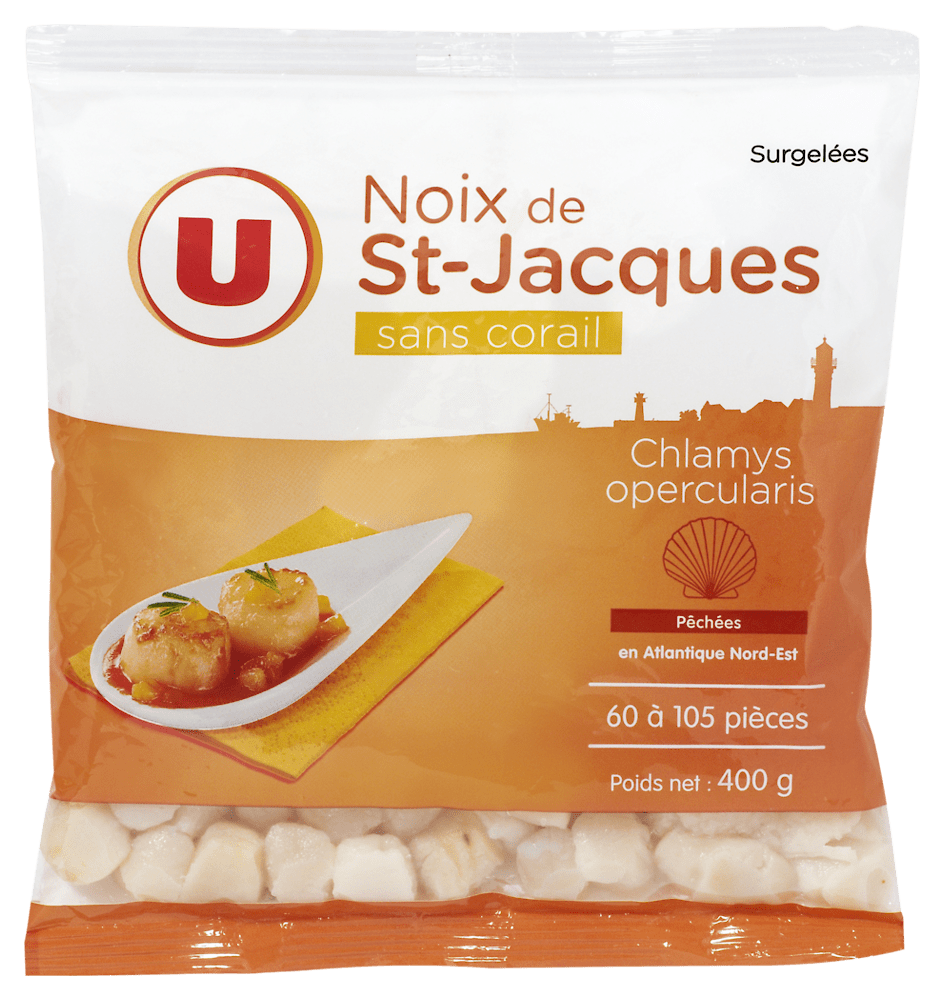 Noix Saint Jacques/pétoncle sans corail U 60/105pièces 400gNoix Saint Jacques/pétoncle sans corail U 60/105pièces 400g