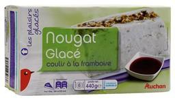 NOUGAT glacé : eau, pâte de NOUGAT 12% [AMANDE émondée grillée (FRUIT À COQUE), NOUGAT (AMANDE émondée grillée (FRUIT À COQUE), sirop de glucose, miel, sucre, blanc d'OEUF, arôme naturel de vanille)], CRÈME fraîche (contient LAIT), LACTOSE (contient LAIT) et PROTÉINES DE LAIT, sucre, AMANDE hachée grillée caramélisée (FRUIT À COQUE) 5% (AMANDE (FRUIT À COQUE), sucre, sirop de glucose, miel), brisures de NOUGAT enrobées 4% [NOUGAT (AMANDE émondée grillée (FRUIT À COQUE), sucre, sirop de glucose, miel, ALBUMINE d'OEUF, pain azyme (fécule de pomme de terre, eau), arôme naturel de vanille), enrobage : graisse de coprah], miel, grains de NOUGATINE 2% (sucre, NOISETTE torréfiée (FRUIT À COQUE)), LAIT ÉCRÉMÉ en poudre, PISTACHE hachée grillée (FRUIT À COQUE) 1%, émulsifiant : mono- et diglycérides d'acides gras, épaississants (farine de graines de caroube, gomme guar), gélifiant : carraghénanes. Sachets de coulis à la framboise : purée de framboise 75%, sucre, eau, gélifiant : pectine. Pourcentages exprimés sur chaque couche du produit fini.
