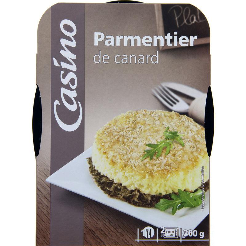 Eau - aiguillette de canard (origine : France) 18% - purée de pomme de terre 15% - crème fraîche - champignon 5% - flocon de pomme de terre déshydraté 4% (pomme de terre déshydratée - émulsifiant : mono et diglydérides d’acides gras) - emmental râpé - oignon - graisse de canard - farine de blé - oignon déshydraté - Porto rouge - amidon de maïs - chapelure (farine de blé - sel) - sel - pulpe d’ail - caramel aromatique (sucre - eau - sirop de glucose-fructose) - muscade - poivre - curcuma - arôme naturel de poivre. Les informations en gras sont destinées aux personnes intolérantes ou allergiques.