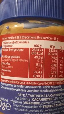 CACAHUÈTES 92%, huiles végétales (ARACHIDE, palme**), sucre, sel. **ce produit contribue à la production d'huile de palme certifiée durable. Www. Rspo. Org