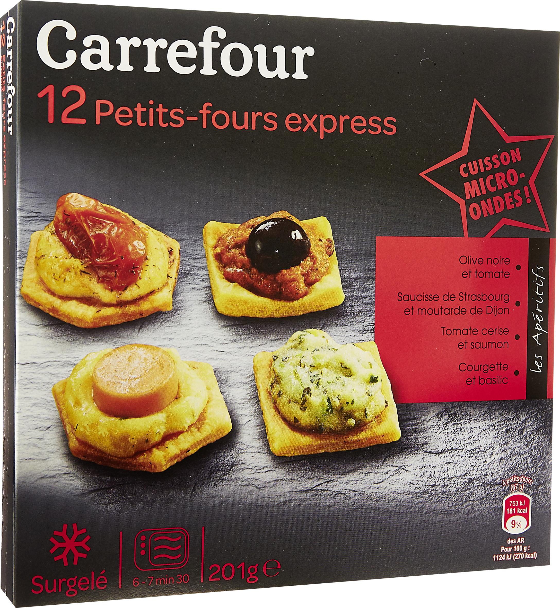 3 Petits-fours Olive noire et tomate, 25.4%: Pâte 41% [farine de blé (farine de blé, gluten de blé), margarine (graisse partiellement fractionnée de palme, eau, huile de colza, sel, émulsifiant : mono- et diglycérides d’acides gras, correcteur d’acidité : acide citrique), eau, fromage blanc, levure désactivée, extrait de malt d’orge, sel, œuf en poudre, colorant : extrait de paprika], olive noire dénoyautée 13% (olive noire, sel), courgette, eau, purée de tomate mi-réduite 6.2%, poivron rouge, double concentré de tomate 4.1%, oignon préfrit (oignon, huile de tournesol), huile d’olive vierge extra, préparation pour sauce blanche en poudre (lactosérum, amidon modifié de pomme de terre, lactose, lait écrémé en poudre, crème en poudre, farine de blé, sel, muscade, poivre noir), préparation à base d’aubergine (aubergine grillée, huile de colza, vinaigre de Xérès, sel, origan, ail, acidifiant : acide citrique), tomate mi-séchée assaisonnée 1.6% (tomate mi-séchée 1.5%, huile de colza, sel, origan, ail), fibre de bambou, persil déshydraté, sel, tomate en poudre 0.2%, sucre, extrait de chicorée, ail déshydraté, basilic déshydraté, maltodextrine, stabilisants : hydroxypropylméthylcellulose et gomme guar, piment d’Espelette, dextrose, poivre gris, extrait d’ail et de thym, oignon déshydraté, origan déshydraté. Pourcentages exprimés sur le petit-four Olive noire et tomate. Malgré tout le soin apporté à la fabrication de ce petit-four, il peut contenir des morceaux de noyau d'olive.