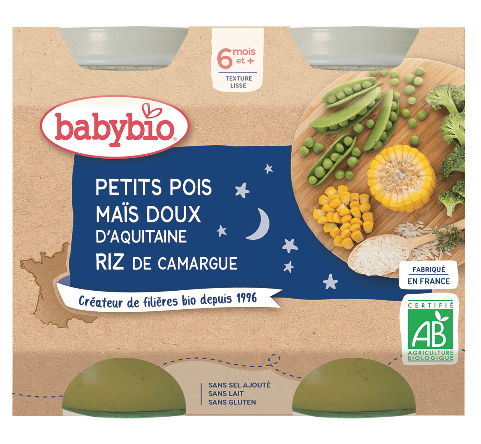 Eau de cuisson, petits pois de France* 25%, maïs doux d'Aquitaine* 15%, oignons de France* 10%, brocolis d'Espagne* 8%, riz de Camargue IGP* 7%, huiles végétales* (colza*, tournesol*), thym*. *Ingrédients issus de l'agriculture biologique