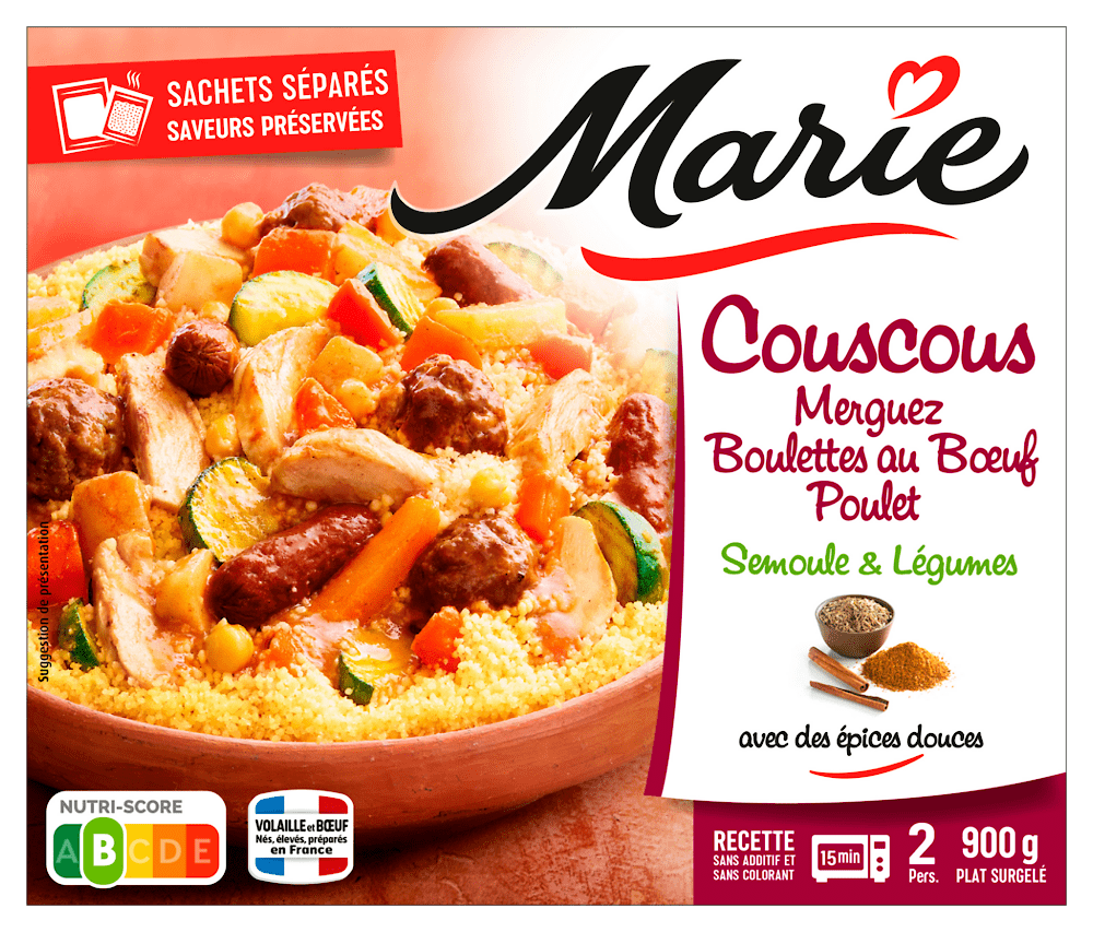 Ingrédients : semoule 26,6% (eau, semoule de BLE dur, huile d'olive vierge, sel), eau, courgettes grillées 11,6%, carottes 10,2%, navets 7,8%, oignons préfrits (dont huile de tournesol), merguez 4,4% (viande de bœuf origine France, gras de boeuf, épices et plantes aromatiques, sel, sirop de glucose, dextrose, arômes naturels), boulettes au boeuf 4,4% préparation de viande de boeuf cuite : viande de boeuf origine France 2,8%, blanc d'OEUF de poules élevées en plein air, chapelure (farine de BLE, sel), oignons réhydratés, fond de boeuf (viande et jus de cuisson de viande de boeuf, sel), fécule de pomme de terre, bouillon de légumes (légumes et jus de cuisson des légumes : carottes, tomates, oignons, ail), bouillon de boeuf, huile de tournesol, sel, tomates pelées concassées au jus 3,3% (tomates, jus de tomates), poulet mariné et cuit 2,7% (viande de poulet origine France 2,6%, sel, sucre, jus de citron), pois chiches 2,7%, double concentré de tomates, amidon de riz, huile olive vierge, fond de volaille (viande et graisse de poulet, fécule de pomme de terre, sel, LAIT ÉCRÉMÉ en poudre, épice et plante aromatique, extrait de carottes, extraits d'épice et de plantes aromatiques), ail, épices et aromates (cumin, curry, ail, anis, cannelle, coriandre, fenouil, gingembre, girofle, curcuma, badiane, poivre, paprika), sel, purée de piments (piments, sel). semoule de BLÉ : origine UE et non-ue (canada).