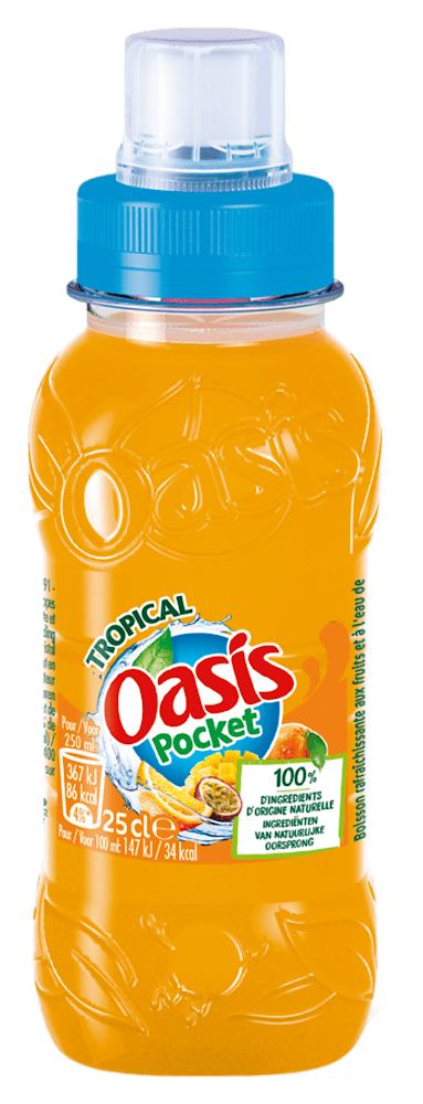 Eau de source 80%, jus de fruits à base de concentrés 12% (orange 6%, pomme 5,3%, fruit de la passion 0,1%, ma, gue 0,07%), sucre, acidifiant : acide citrique et alpha-tocophérol, colorant : luteine, acide carminique et extrait de paprika, arômes, stabilisant : gomme d'acacia
