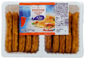 Colin d’Alaska ** (poisson) 35%, eau, chapelure 16% (farine de blé, levure, sel, épices: curcuma, paprika), fromage fondu 11% (fromages (lait), eau, beurre (lait), poudre de lactosérum (lait), protéines de lait ; sels émulsifiants : citrates de sodium, phosphates de sodium, polyphosphates ; sel ; gélifiants : carraghénanes, alginate de sodium), huiles végétales (tournesol, colza), préparation à base de pomme de terre déshydratée (pomme de terre déshydratée, sel, blanc d'œuf en poudre, aromate), farine de blé, épaississant : méthylcellulose.