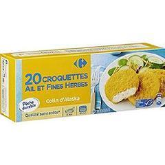 Croquettes de chair hachée de COLIN d'Alaska MSC agrémentées d'ail et fines herbes, panées, préfrites, surgelées, qualité sans arête chair hachée de COLIN d'Alaska MSC 50% (theragra chalcogramma pêché au chalut en Océan Pacifique Nord-Est et Nord-Ouest), farine de BLE, eau, amidon de BLE, huile de tournesol, poudre de LAIT ÉCRÉMÉ, pommes de terre, sel, plantes aromatiques 0,4% (ciboulette 0,3%, persil déshydraté 0,1%), poudre d'ail 0,4%, levure, épices (paprika, curcuma), LACTOSE, extrait d'épices (sel, amidon de pomme de terre, dextrose, extrait de poivron, extrait de piment de cayenne), amidon de maïs modifié.