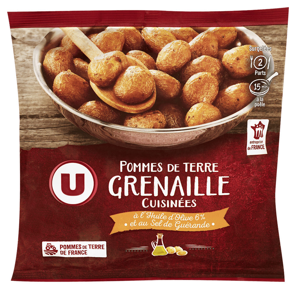 Pommes de terre grenaille préfrites 93% [pommes de terre grenaille (France) 92%, huiles végétales (tournesol, colza)], huile d’olive vierge extra 6%, sel de guérande 0,6%, poivre.