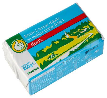 beurre (contient lait ), eau, ferments lactiques, émulsifiant : mono- et diglycérides d'acides gras - stabilisant : alginate de sodium - sel 0,15%, colorant : caroténoïdes - vitamine e.