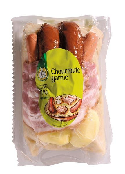 choucroute cuisinée 65% : choucroute 48%, jus de cuisson, saindoux (graisse de porc fondue), graisse d'oie, vin blanc (contient sulfites ), arôme, sel, baies de genièvre, antioxydant : acide ascorbique. pommes de terre 8% : pommes de terre, sel, conservateur :  disulfite de sodium. saucisses fumées cuites 7% : viande de porc 6,5%, eau, sel, épices et plantes aromatiques, stabilisants : triphosphates, diphosphates - dextrose, antioxydants : érythorbate de sodium, acide ascorbique - arômes, conservateur : nitrite de sodium. enveloppe : boyau naturel de porc.  knack 7% : viande de porc 3,2%, gras de porc, eau, viande bovine 0,5%, sel, fibres de pois, protéines de lait , épices et plantes aromatiques, lactose ( lait ), stabilisants : triphosphates, diphosphates - dextrose, exhausteur de goût : glutamate monosodique - acidifiant : glucono-delta-lactone - antioxydants : acide ascorbique, ascorbate de sodium - extraits d'épices, conservateur : nitrite de sodium. enveloppe : boyau naturel de mouton. saucisson cuit à l'ail 7% : viande de porc 5,7%, eau, sel, stabilisants : triphosphates, diphosphates - épices et plantes aromatiques, blanc d' œuf en poudre, gras de porc, plasma de porc sec, ail 0,01%, sirop de glucose, dextrose, antioxydant : érythorbate de sodium - conservateur : nitrite de sodium - colorant : carmins. poitrine de porc fumée cuite 6% : poitrine de porc traitée en salaison 5%, eau, sel, stabilisants : triphosphates, diphosphates - bouillon, sirop de glucose, dextrose, lactose ( lait ), conservateur : nitrite de sodium - arômes.  pourcentages exprimés sur le total de la recette.