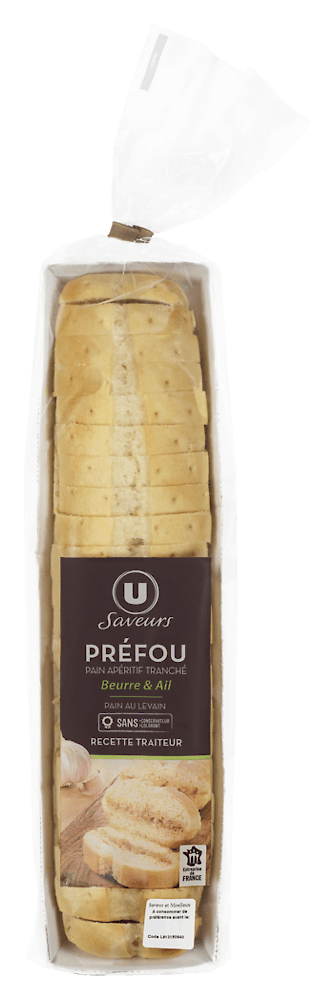 Préfou, pain apéritif tranché beurre et ail U SAVEURS 300gPréfou, pain apéritif tranché beurre et ail U SAVEURS 300g