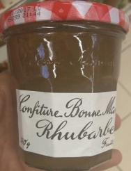 Rhubarbe, sucre, sucre roux de canne, jus de citrons concentré et éventuellement, gélifiant : pectine de fruit