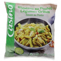 Pâtes alimentaires rigatoni cuites 52,3% (eau - semoule de BLÉ dur) - morceaux de poulet rôti cuit traité en salaison 15% [filet de poulet 12% (origine : UE) - amidon - dextrose - sel] - courgette grillée 8% - eau - basilic 4,1% - poivron rouge grillé 4% - poivron orange grillé 4% - huile de tournesol - huile d'olive vierge extra 1,6% - ail 0,4% - sel - pignon de pin 0,1% - amidon transformé - FROMAGE PARMIGIANO reggiano 0,1% - FROMAGE à pâte dure - extrait de poivre. Les informations en gras sont destinées aux personnes intolérantes ou allergiques.
