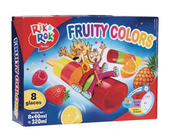 BATONNET FRUITY COLORS Glace à l’eau aromatisée à l’ananas 40,5% : eau, sucre, sirop de glucose-fructose, jus d’ananas concentré 1,8%, acidifiant : acide citrique - stabilisants : gomme guar, farine de graines de caroube, carraghénanes - colorants : caroténoïdes, curcumine - arôme. Glace à l’eau aromatisée à la fraise 20% : eau, purée de fraises 2,6%, sucre, sirop de glucose-fructose, acidifiant : acide citrique - stabilisants : gomme guar, farine de graines de caroube, carraghénanes - colorant : rouge de betterave, arôme. Glace à l’eau aromatisée à l’orange 16% : eau, sucre, sirop de glucose-fructose, jus d’orange concentré 0,7%, colorant : extrait de paprika, acidifiant : acide citrique - stabilisants : gomme guar, farine de graines de caroube, carraghénanes - arôme. Glace à l’eau aromatisée au citron 13,5% : eau, sucre, sirop de glucose-fructose, jus de citron concentré 0,2%, acidifiant : acide citrique - colorants : curcumine, complexes cuivre-chlorophyllines - stabilisants : gomme guar, farine de graines de caroube, carraghénanes - arôme. Glace à l’eau aromatisée à la framboise 10% : eau, sucre, sirop de glucose-fructose, jus de framboise concentré 0,2% - colorants : rouge de betterave, complexes cuivre-chlorophyllines, caroténoïdes - stabilisants : gomme guar, farine de graines de caroube, carraghénanes - arôme. Pourcentages exprimés sur le total de la recette.