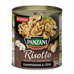 Eau,  riz 10%, oignons, champignons de Paris 5 % (sel, acidifiant : acide citrique, antioxydant: acide ascorbique), crème 2% (LAIT, stabilisant : carraghénanes), cèpes 2% (acidifiant : acide citrique), vin blanc, LAIT en poudre, arômes (dont LAIT, CELERI), huile de colza,  sel, stabilisants : polyphosphates, orthophosphates ; parmesan (LAIT),  échalote, épaississants : farine de graines de carboube, gomme guar  ; poudre d'oignons grillés.