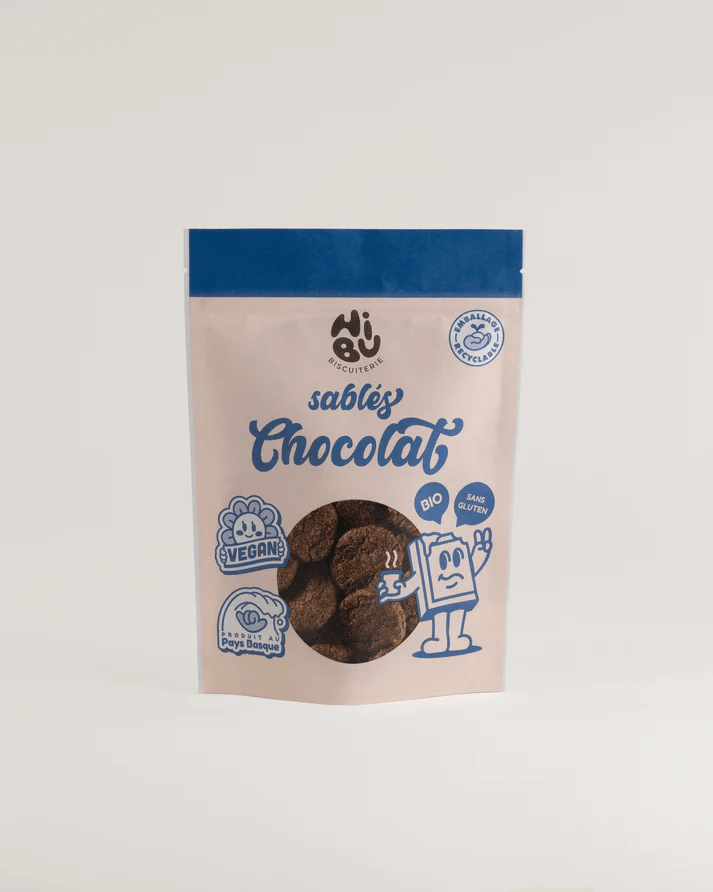 Pépites de chocolat noir 18% (masse de cacao, sucre de canne, beurre de cacao, extrait de vanille), eau, sucre blond de canne, chocolat noir 12% (pâte de cacao, beurre de cacao, extrait de vanille), farine de maïs, farine de riz complet, amidon de maïs, poudre de cacao 3%, huile de tournesol, huile de colza, farine de pois chiche, poudre à lever (bicarbonate de sodium, tartrate monopotassique)
