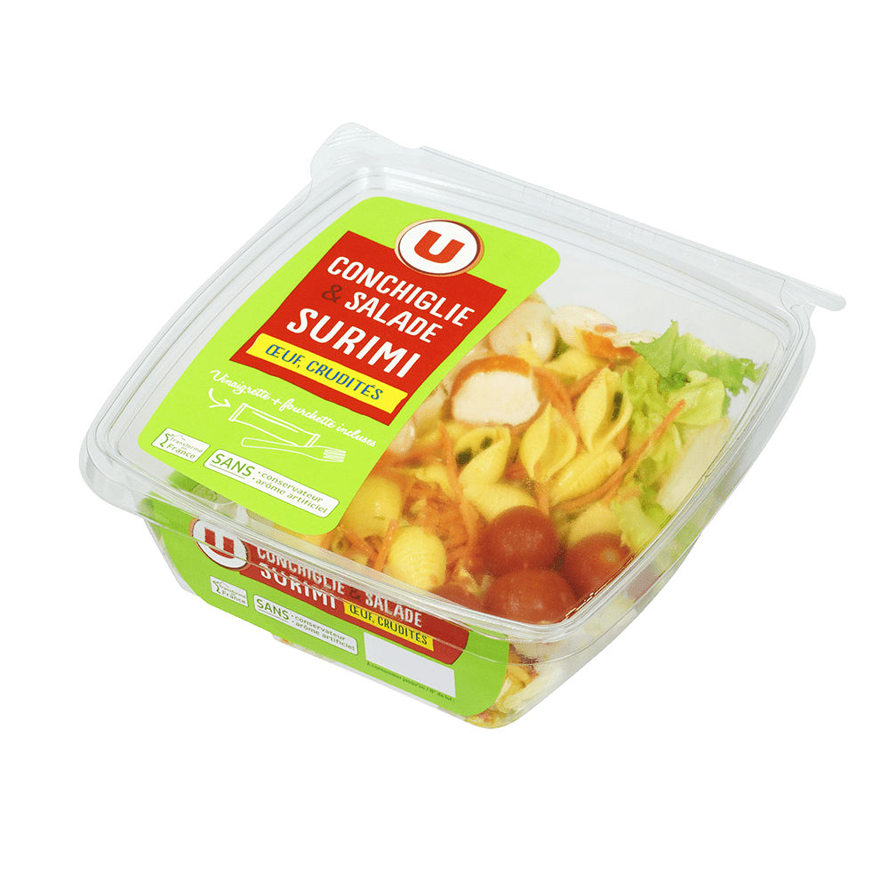 Salade composée à base de pâte alimentaire conchiglie aromatisée au curcuma cuite, salade mélangée verte et rouge et préparation à base de surimi accompagnée d'une dosette de vinaigrette.Salade composée à base de pâte alimentaire conchiglie aromatisée au curcuma cuite, salade mélangée verte et rouge et préparation à base de surimi accompagnée d'une dosette de vinaigrette.