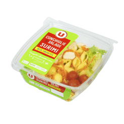 Salade composée 90.3% : pâte alimentaire conchiglie aromatisée au curcuma cuite 27% (eau, semoule de BLE dur, OEUF, curcuma déshydraté 0.02%), salade mélangée verte et rouge 22% (laitue et chicorée), préparation à base de surimi 12% [surimi 4% (chair de POISSON, sucre), eau, amidon de BLE, blanc d'OEUF en poudre réhydraté, huile de colza, sel, arôme naturel (dont CRUSTACES et POISSONS), colorant : extrait de paprika], oeuf dur 12% (OEUF, acidifiants : acide citrique et acide acétique, sel), tomate cerise 6%, carotte 3%, maïs* 3%, ciboulette*, huile de colza, sel. Vinaigrette 9.7% : huile de colza, vinaigre, moutarde (eau, graines de MOUTARDE, vinaigre, sel), sel, poivre.* produit décongelé, ne pas recongeler. Certains ingrédients de ce produit ne proviennent pas de France.Dosette : Huile de colza, vinaigre, moutarde (eau, graines de MOUTARDE, vinaigre, sel), sel, poivre. /