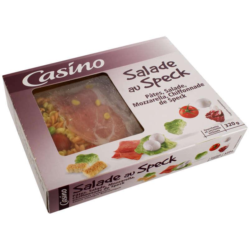 Salade composée 89.1% : mini conchiglie cuites aromatisées au curcuma 28.5% (eau - semoule de BLÉ dur de qualité supérieure - curcuma) - mini torsades cuites aromatisées à la tomate et à la betterave 22% (eau - semoule de BLÉ dur de qualité supérieure - tomate - betterave) - salades mélangées 14% (laitue 11.2%, chicorée 2.8%) - tomates cerise 7.8% - MOZZARELLA décongelée 6.2% (LAIT de vache pasteurisé - sel - présure animale - coagulant enzymatique - correcteur d’acidité : acide citrique) - jambon speck fumé 5.3% (viande de porc 5.1% - sel - épices - dextrose - arômes naturels - conservateurs : nitrate de potassium, nitrite de sodium) - fèves de SOJA décongelées - huile d’olive vierge extra - huile de colza - basilic décongelé- sel. Vinaigrette au vinaigre balsamique 6.2% : huile de colza - vinaigre balsamique 1.5% (vinaigre de vin (contient SULFITES)- moût de raisin concentré et cuit - colorant : E150d) - huile d'olive vierge extra. Sachet de batonnets de pain spécial 4.7% : farine de BLÉ - huile de tournesol - levure - sel. Les informations en majuscules sont destinées aux personnes intolérantes ou allergiques.