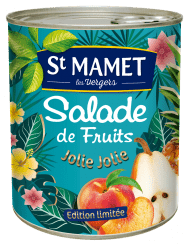Ingrédients : poires demi-fruits (24%), oreillons de pêches (19%), oreillons d'abricots (10%), tranche entière d'ananas (4%), eau, sucre, acidifiant : acide citrique